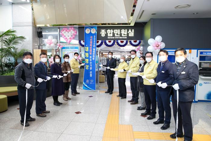 행정안전부가 주관하는 '2020 국민행복민원실' 최우수 인증기관으로 선정된 경기 이천시가 신축년 새해와 최우수기관 인증을 기념해 5일 종합민원실 입구에서 현판식을 개최했다. 이날 행사에는 엄태준 시장을 비롯해 민원담당 공무원 등이 참석했다. 사진은 엄 시장과 관계자들이 현판식을 진행하는 모습. (사진제공=이천시청)