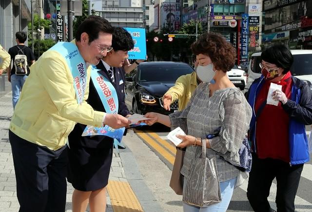 | ▲ 이용섭 광주광역시장이 4일 오후 남구청사 앞에서 백운고가 철거와 지하철2호선 공사로 인한 교통안전대책을 홍보하기 위해 '교통사고 줄이기 범시민 캠페인'을 펼치고 있다./광주광역시 제공 |