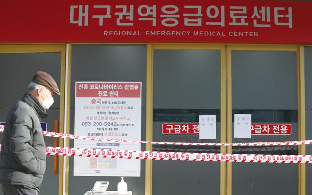 19일 오전 대구지역에서 신종 코로나바이러스 감염증(코로나19) 확진자가 다수 발생한 것으로 알려진 가운데 대구시 중구 경북대학교 병원 응급실이 폐쇄됐다.