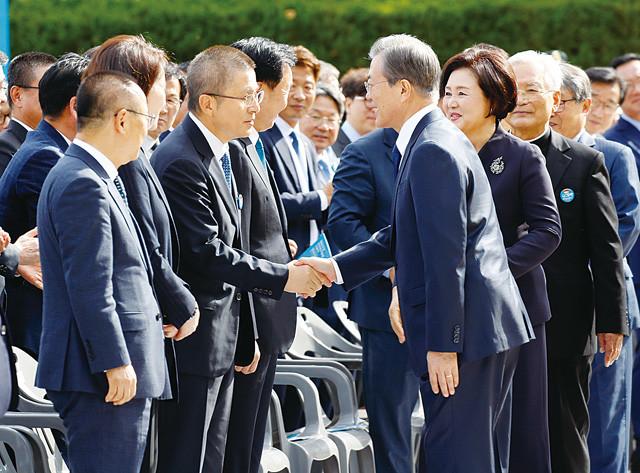 문재인 대통령이 16 오전 경남 창원시 경남대학교 운동장에서 열린 40주년 부마민주항쟁 기념식에 참석하기 위해 입장하며 황교안 자유한국당 대표와 인사하고 있다.