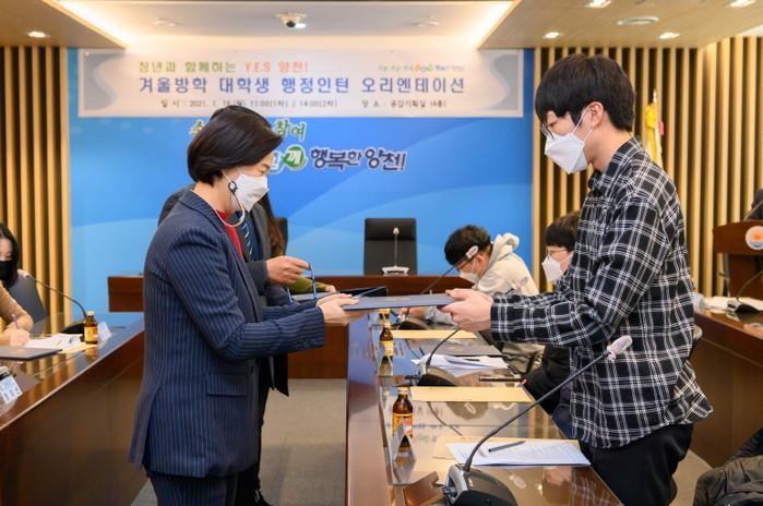 서울 양천구는 겨울방학을 맞이한 지역내 대학생들로 행정 인턴을 50명 모집해 구정에 직접 참여하는 기회를 제공한다. 대학생 행정인턴은 한 달간 구청·도서관 등에서 활동하게 된다. 사진은 김수영 구청장(왼쪽)이 대학생 행정인턴에게 임용장을 수여하는 모습. (사진제공=양천구청)