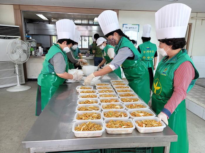 경기 안산시새마을회는 최근 추석명절을 앞두고 경제적으로 어려움을 겪는 저소득가정 200가구에 ‘정성가득! 영양듬뿍!’ 반찬 나눔 행사를 개최했다. 행사를 통해 반찬 3종(진미채·장조림·어묵볶음)을 직접 만들어 포장한 뒤 해당 가정에 비대면 방식으로 전달했다. 사진은 새마을회 회원들이 반찬을 포장하고 있는 모습.(사진제공=안산시청)
