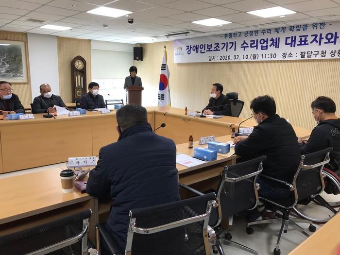 경기 수원시 팔달구는 10일 구청 상황실에서 '장애인 보조 기기 수리비 지원 사업'의 올바른 이해를 돕기 위해 수리업체 대표자 8명과의 간담회를 개최했다. 사진은 참여자들이 회의하는 모습. (사진제공=팔달구청)