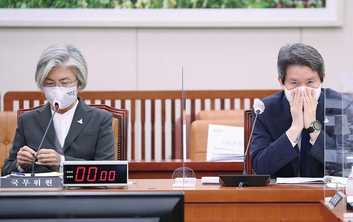 강경화 외교부 장관과 이인영 통일부 장관이 28일 오전 서울 여의도 국회에서 열린 외교통일위원회 전체회의에 참석하고 있다.