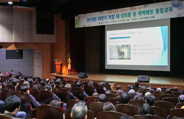 서울 강서구는 최근 강서구민회관에서 전직원을 대상으로 ‘2019년 직장내 성희롱 등 폭력 예방교육’을 실시했다. 이날 한국양성평등교육진흥원 성희롱·성폭력 예방교육 강사인 장현정 변호사가 성희롱 예방법 등에 대해 강의했다. 사진은 교육 진행 모습.(사진제공=강서구청)