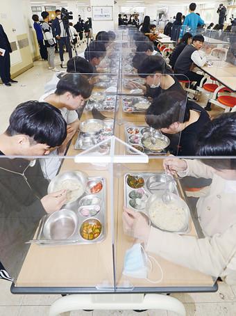 고등학교 3학년 등교 수업 첫날인 20일 오후 청주시 흥덕구 봉명고등학교 급식실에서 학생들이 칸막이가 설치된 식탁에서 밥을 먹고 있다.
