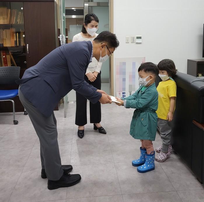 경기 수원시 영통구 영통1동은 7일 청명마을 삼성아파트 단지내 삼성래미안어린이집으로부터 지역내 홀몸노인을 위한 후원금을 전달받았다. 사진은 전달식에서 구 관계자가 어린이집 원아로부터 후원금을 전달받고 있는 모습. (사진제공=영통구청)