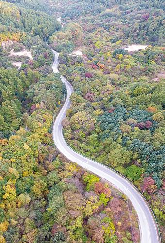 철원의 아침 기온이 영하 2.9도까지 떨어지는 등 강원 내륙 곳곳이 올가을 들어 가장 추운 날씨를 보인 15일 오전 인제군 남면 갑둔리의 도로 주변이 단풍으로 물들고 있다.