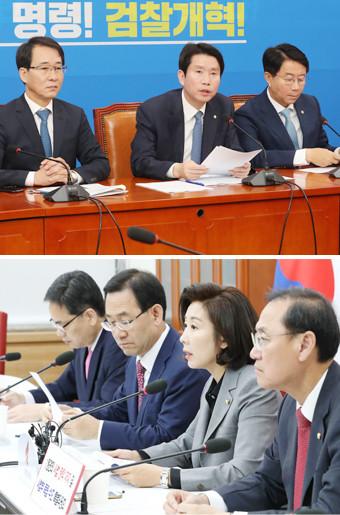 더불어민주당 이인영 원내대표가 10 오전 국회에서 열린 정책조정회의에서 발언하고 있다(). 10 오전 국회 자유한국당 원내대표실에서 열린 문재인 정권의 사법 장악 저지 사법부 독립 수호 특별위원회 회의에서 나경원 원내대표가 발언하고 있다.
