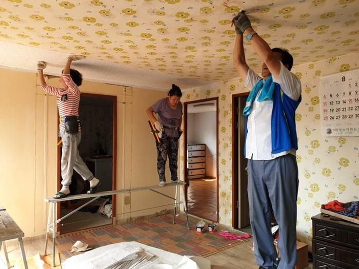 경기 포천시 영북면 지역사회보장협의체는 22일 지역내 장애인 취약가구를 대상으로 '주거환경개선사업'을 추진했다. 이날 협의체 위원 10여명은 도배 및 장판 교체, 전기배선 공사, 집청소 등을 진행했다. 사진은 관계자들이 도배하는 모습. (사진제공=포천시청)
