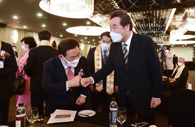 더불어민주당 이낙연 대표(오른쪽)와 국민의힘 주호영 원내대표가 14일 오전 서울 여의도 CCMM빌딩에서 열린 제1회 대한민국 헌정대상 시상식에서 인사하고 있다.