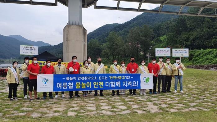 전남 곡성군이 13일 곡성청소년야영장에서 여름철 물놀이 안전사고를 예방하기 위한 안전문화 캠페인을 전개했다. 이날 유관기관·단체 등 40여명의 참여자들은 물놀이 시설을 방문한 관광객과 군민들을 대상으로 휴가철 코로나19 방역수칙 준수, 물놀이 안전사고 예방 국민행동요령, 안전신문고 사용 등 홍보 전단지를 배부했다. 사진은 유근기 군수 및 참여자들이 캠페인을 펼치는 모습. (사진제공=곡성군청)