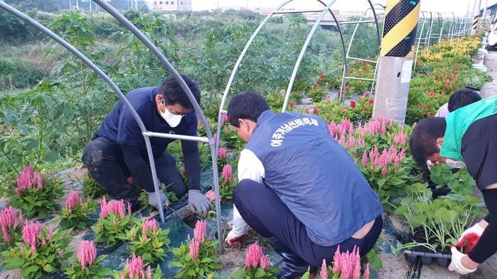 경기 여주시 가남읍 축제추진위원회와 새마을협의회에서는 지난 21일 여주선비장터축제를 대비해 대신천변에 꽃넝쿨 지지대를 제작·설치하고 관상용 호박모종 식재 및 하천변 대청소를 실시했다. 사진은 이날 봉사자들이 관상용 호박모종을 식재하고 있는 모습. (사진제공=여주시청)