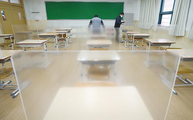 26일 오전 울산시 북구 동천고등학교에 마련된 수능 시험장 책상 위에 반투명 아크릴 재질의 가림막이 설치되고 있다.