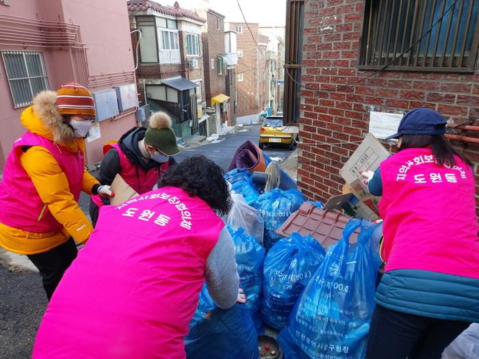 인천 중구 도원동지역사회보장협의체는 14일 중구 자원봉사센터, 중구 환경관리과와 협력해 주거환경 개선 사업을 진행했다. 사업 지원대상자는 홀로 사는 청장년 1인 가구로서 오랜 기간 집안 내부를 청소 하지 않은 상태로 음식물 쓰레기 및 생활쓰레기와 함께 생활하고 있어 개인 위생 및 질병에 노출되기 쉬운 상황에 놓여 있었다. 사진은 참여자들이 쓰레기를 치우고 있는 모습. (사진제공=인천 중구청)