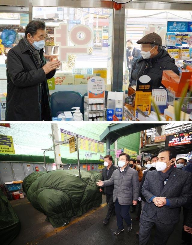 더불어민주당 이낙연 공동 상임선대위원장이 27일 마스크 수급상황을 점검하기 위해 서울 종로의 약국을 방문, 대화하고 있다(위). 미래통합당 황교안 대표가 27일 임시 휴장중인 대구 중구 서문시장을 찾아 살펴보고 있다.