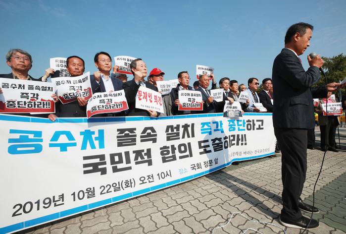 사회정의를 바라는 전국교수모임 회원들이 22일 오전 서울 여의도 국회 앞에서 공수처 설치 중단 촉구 기자회견을 열고 발언하고 있다.