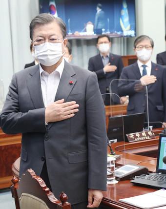 문재인 대통령이 29일 오전 청와대에서 열린 국무회의에서 국기에 경례하고 있다. 문대통령은 “정부는 위기에 놓인 국민의 삶을 지키기 위해 9조3000억원 규모의 3차 재난지원금을 신속히 지원하기로 결정했다”며 “코로나 상황, 정부의 방역조치로 피해를 입고 있는 소상공인과 고용 취약계층 보호를 위한 맞춤형 피해지원 대책으로, 한시가 급한 만큼 내년 1월 초부터 신속하게 집행하겠다”고 덧붙였다. 오른쪽은 변창흠 국토교통부 장관.