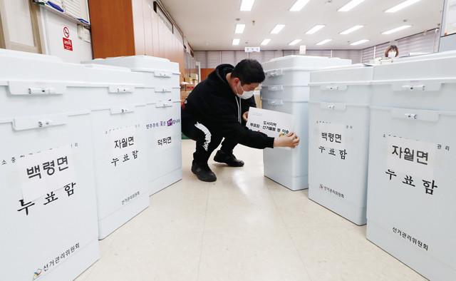26일 오후 인천 중구 옹진군선거관리위원회에서 한 관계자가 제21대 총선에 사용할 투표함을 섬 지역을 보낼 준비를 하고 있다.