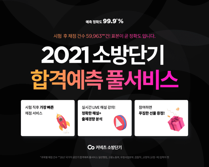 [시민일보 = 여영준 기자] 에스티유니타스(ST Unitas)의 소방공무원 전문 브랜드 ‘커넥츠 소방단기(이하 소방단기)’가 3일 시행되는 소방공무원시험 당일 빠른 가답안 및 합격선을 공개하는 ‘합격예측 풀서비스’를 제공한다.
