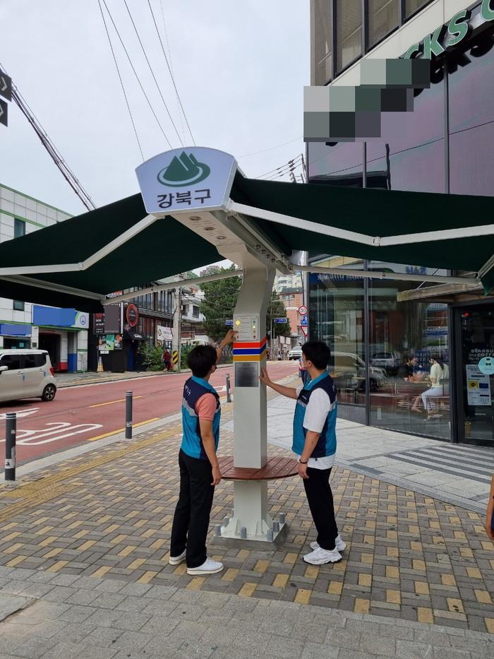 | ▲ 구 관계공무원이 지능형 그늘막이 설치된 모습을 살펴보고 있다. (사진제공=강북구청) |