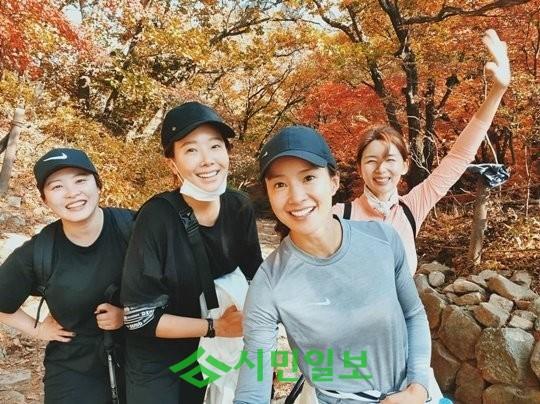 사진 속엔 색색의 단풍잎이 가득한 산을 등반하고 있는 배우 이시영, 소유진, 박솔미와 개그우먼 심진화가 보인다. 네 사람은 훈훈한 비주얼과 두터운 우정을 자랑했다.