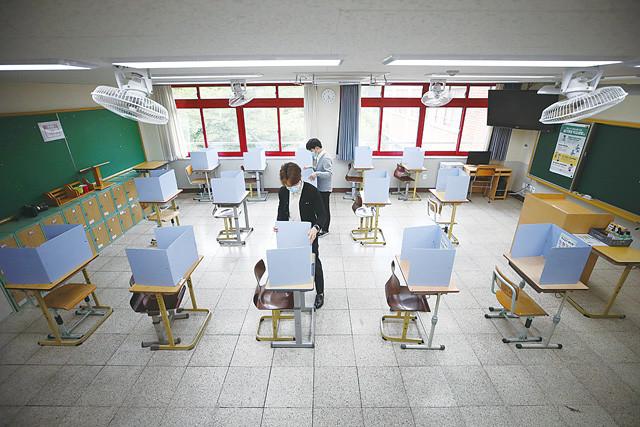 고등학교 3학년 학생들의 등교를 하루 앞둔 19일 대구시 수성구 정화여자고등학교 3학년 교실에서 담임 선생님 등이 신종 코로나바이러스 감염증(코로나19) 확산방지를 위해 책상마다 설치된 가림막을 살펴보고 있다.