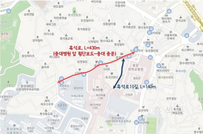 사업 구간은 ▲흑석로(중앙대병원 앞 횡단보도~중앙대 정문 앞 도로) 430m ▲흑석로10길(중앙대학교 · 중대부속 초등학교 학생의 통학로)140m 주변이다.
