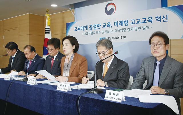 사회부총리 교육부 장관(오른쪽 세번째) 7 오후 정부서울청사에서 자율형사립고(자사고)·외국어고(외고)·국제고를 2025 일제히 일반고로 전환한다는 내용을 골자로 하는 ‘고교서열화 해소 일반고 교육역량 강화 방안’을 발표하고 있다. 왼쪽부터 도성훈 인천시교육청·장희국 광주시교육청·최교진 세종시교육청 교육감, 부총리, 이재정 경기도 교육청·조희연 서울시교육청 교육감.