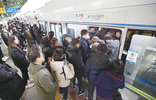 파업 이틀째인 21 오전 서울 구로구 지하철 1호선 구로역이 승객들로 붐비고 있다.