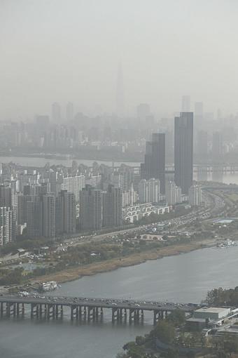 농도가 ‘나쁨’ 수준을 보인 29 오전 서울 영등포구 63스퀘어에서 바라본 송파구 일대가 뿌연 먼지에 뒤덮여 있다.