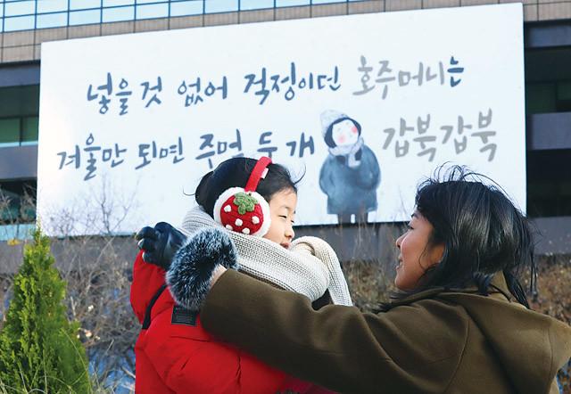 오전 옷으로 갈아입은 서울 교보생명 광화문글판 앞에서 모델들이 포즈를 취하고 있다. 이번 교보생명 광화문글판 ‘겨울편’은 윤동주의 ‘호주머니’에서 발췌했다. 교보생명 관계자는 “어려움 속에서도 주먹을 쥐고 씩씩하게 살아가자는 울림이 시민들에게 위로와 희망이 되길 바란다”고 말했다.