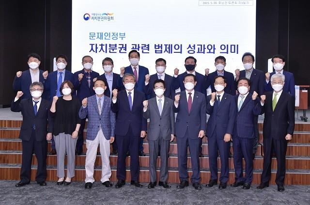 [광주=정찬남 기자] 이용섭 광주광역시장(앞줄 좌측부터 6번째)이 20일 오전 서구 상공회의소에서 대통령소속 자치분권위원회와 대한민국지방신문협의회가 공동 주최한 '지방자치 부활 30주년 전국순회 토론회'에 참석해 김순은 대통령소속 자치분권위원장, 김중석 대한민국지방신문협의회장, 김용집 광주시의회 의장, 지역언론사 대표 등 내빈들과 기념촬영을 하고 있다./광주광역시 제공