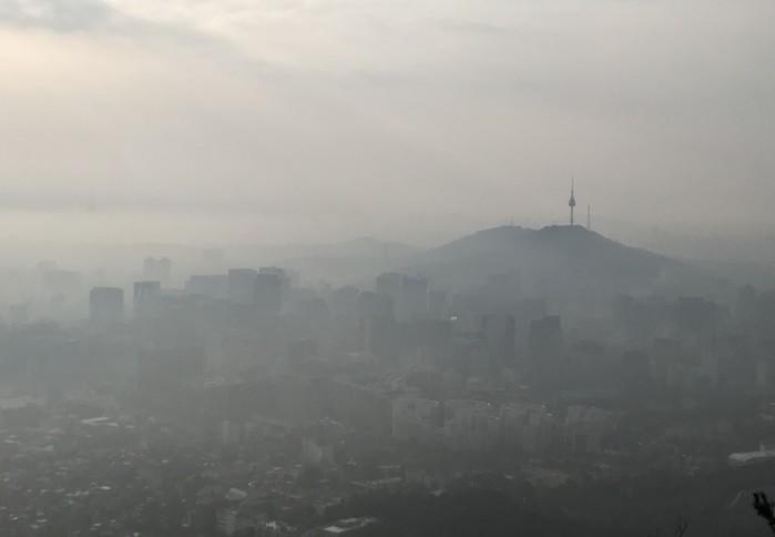 초미세먼지가 나쁨 수준을 보인 1일 오전 서울 종로구 인왕산 정상에서 내려다본 서울 도심이 뿌옇다.