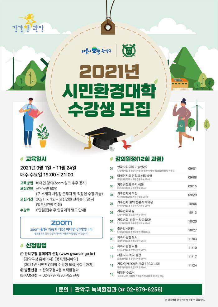 [시민일보 = 여영준 기자] 서울 관악구(구청장 박준희)는 서울대학교와 협력해 지역주민에게 한 차원 높은 환경교육 콘텐츠를 제공하고자 오는 9월부터 ‘2021년 시민환경대학’을 운영한다고 13일 밝혔다.