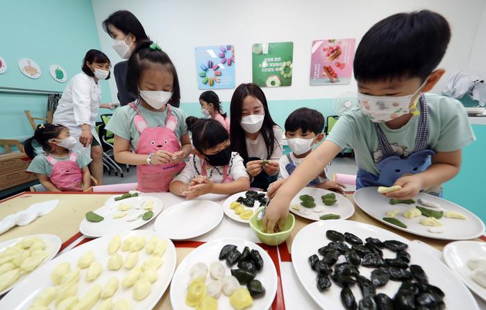 14일 오전 광주 북구 남도향토음식박물관에서 북구청직장어린이집 어린이들이 추석을 앞두고 송편 만들기 체험을 하고 있다.