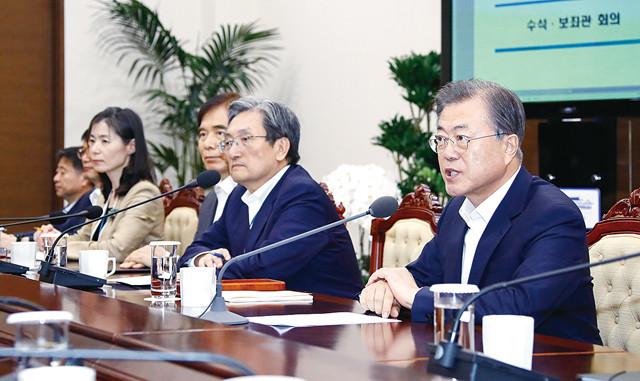 대통령이 12 오후 청와대에서 열린 수석·보좌관회의에서 발언하고 있다. 오른쪽부터 대통령, 노영민 비서실장, 주영훈 경호처장, 김외숙 인사수석.