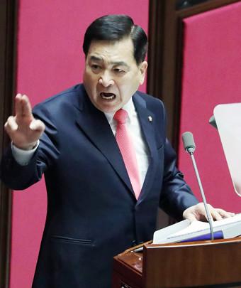 미래통합당 심재철 원내대표가 19일 오전 서울 여의도 국회에서 열린 임시회 본회의에서 교섭단체 대표연설 도중 문재인 정부의 대북 및 부동산 정책 등을 비판하고 있다.