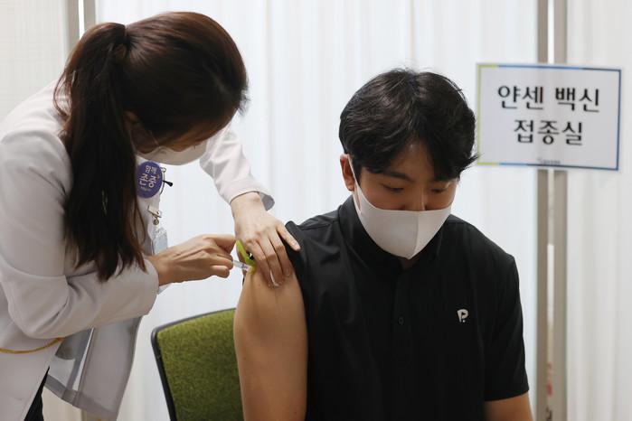 30세 이상 예비군·민방위 등에 대한 코로나19 얀센 백신 접종이 시작된 10일 오전 대구 남구 드림종합병원(지정 위탁의료기관)에서 한 시민이 백신을 접종하고 있다.