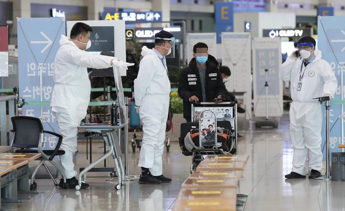 영국발 변이 코로나19 바이러스가 국내에서 확인되는 등 코로나19 확산이 계속되고 있는 28일 오전 인천국제공항 1터미널 입국장에서 방호복을 착용한 관계자들이 해외입국객을 안내하고 있다.