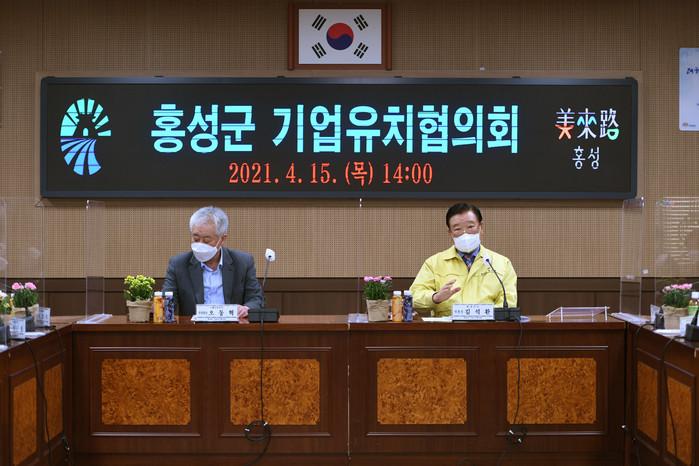 충남 홍성군이 15일 군청 회의실에서 '홍성군 기업유치협의회 정기회의'를 열고 코로나19로 침체된 지역경제에 활력을 불어넣고 지역발전을 견인하기 위해 입주예정 기업 및 단지별 미분양 현황 등 지역내 기업유치 실적을 공유하고 군 기업유치의 발전방향을 주제로 심도 있는 토의를 진행했다. 사진은 이날 회의에서 김석환 군수(오른쪽)가 발언하고 있는 모습. (사진제공=홍성군청)