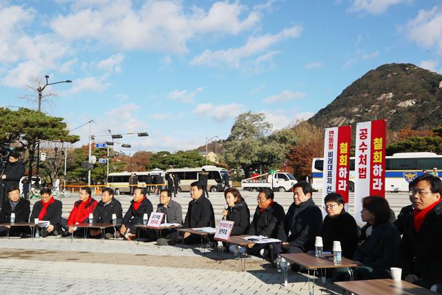 나경원 원내대표가 26 청와대 분수대 앞에서 열린 원내대책회의에서 발언하고 있다. 황교안 대표는 이레째 단식농성을 이어가고 있다.