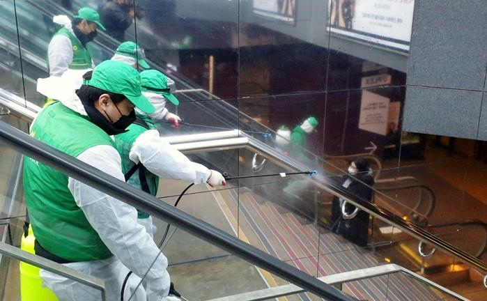 서울 서대문구 새마을지도자협의회가 코로나19 지역사회 확산 차단을 위해 동별로 '새마을 방역단'을 구성해 지역내 다중이용시설 등을 대상으로 대대적인 방역작업을 전개하고 있다. 사진은 최근 단원들이 지하철 계단 난간을 소독하는 모습. (사진제공=마포구청)