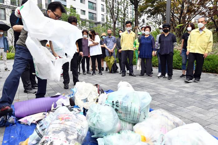 조무영 경기 수원시 제2부시장이 28일 고등동 수원역푸르지오자이에서 진행된 소각용 쓰레기 샘플링에 참여해 공동주택 단지의 쓰레기 분리배출 실태를 점검했다. 사진은 조 제2부시장(오른쪽)이 소각용 쓰레기 샘플링에 참여하고 있는 모습. (사진제공=수원시청)