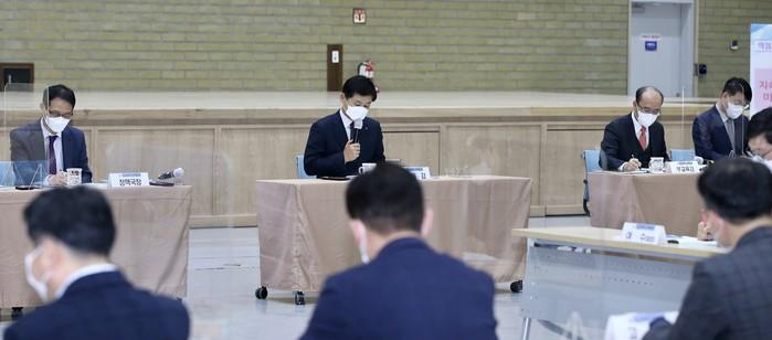 전남도교육청이 21일 순천만생태문화교육원에서 2021년 첫 전남교육혁신 정책협의회를 열고 민주적인 조직문화 조성과 행정 혁신, 신뢰받는 청렴 교육행정 실현 방안을 모색했다. 이날 협의회는 코로나19 감염 예방을 위해 장석웅 교육감을 비롯한 도교육청 행정국 과장 이상 간부와 22개 지역 행·재정지원과장 등으로 참석 인원을 최소화했으며, 방역수칙을 철저히 준수한 가운데 열렸다. 사진은 장 교육감(가운데) 및 관계자들이 회의하는 모습. (사진제공=전남도교육청)