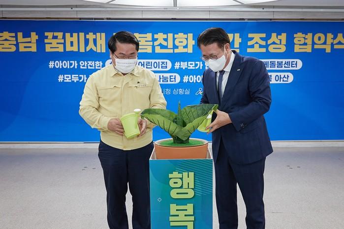 충남 아산시는 24일 충청남도개발공사와 아산 배방 ‘충남 꿈비채’에 보육·돌봄 친화 공간 조성을 위한 업무협약을 체결했다. 이번 협약은 아산 배방 월천지구에 위치한 충남형 행복주택 ‘꿈비채’의 입주민과 지역주민에게 아이 키우기 좋은 보육환경과 육아·돌봄 서비스를 제공하고자 부대 복리시설에 국·공립어린이집, 다함께돌봄센터, 공동육아나눔터를 설치하는 것을 주요 골자로 한다. 사진은 오세현 시장(왼쪽)과 정석완 사장이 새싹에 물을 주고 있는 모습.(사진제공=아산시청)