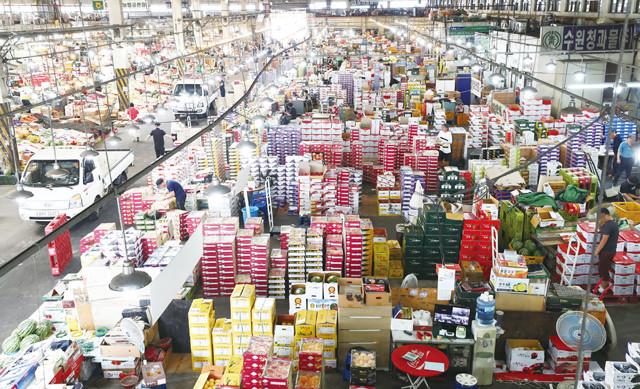 보름여 앞둔 27 오전 경기도 수원시 권선구 수원시농수산물도매시장에 선물용 과일 등이 쌓여 있다.