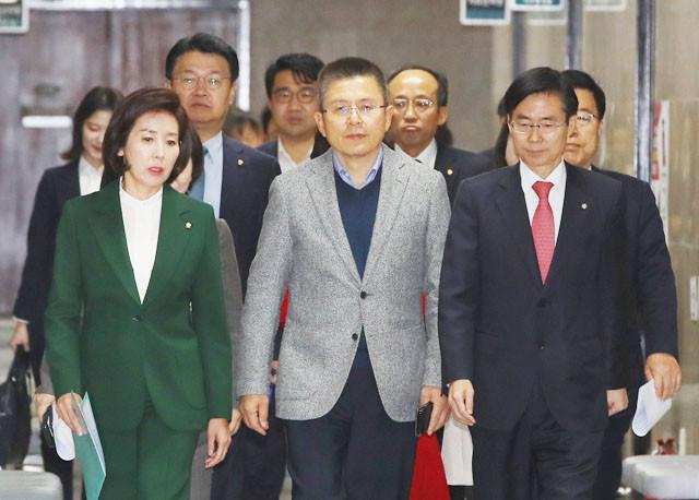 황교안 대표, 나경원 원내대표, 조경태 최고위원 등이 18 국회에서 열린 최고위원회의에 어두운 표정으로 입장하고 있다.