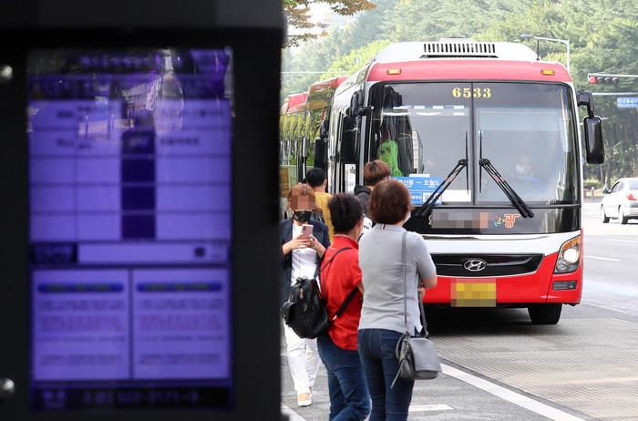 대전시지역버스노동조합이 무기한 파업에 돌입한 30일 오전 대전시 서구 만년동 한 버스정류장으로 전세버스가 들어오고 있다.