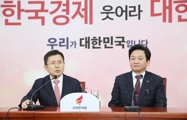 자유한국당 황교안 대표가 22일 오전 국회에서 원희룡 제주도지사와 만나 대화하고 있다.